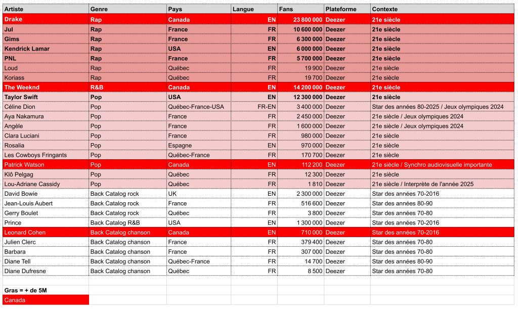 Je me suis amusé à créer un tableau pas très scientifique comparant la performance en nombre de fans des rappeurs français avec les artistes de la pop et artistes populaires historiques des USA, du Canada et du Québec pour commencer à intégrer la révélation que me fait ce livre dans mon paysage musical et numérique.